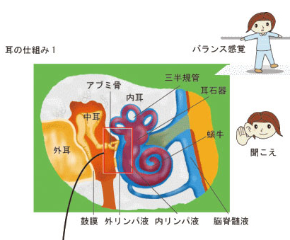 耳の中にある三半規管は、内部が水で満たされた 外リンパ腔と内リンパ腔というパイプ状の管がありますが、頭が動くとこの中の水が動き、その情報が神経を通じて脳に伝わり、平衡感覚を認識しています。